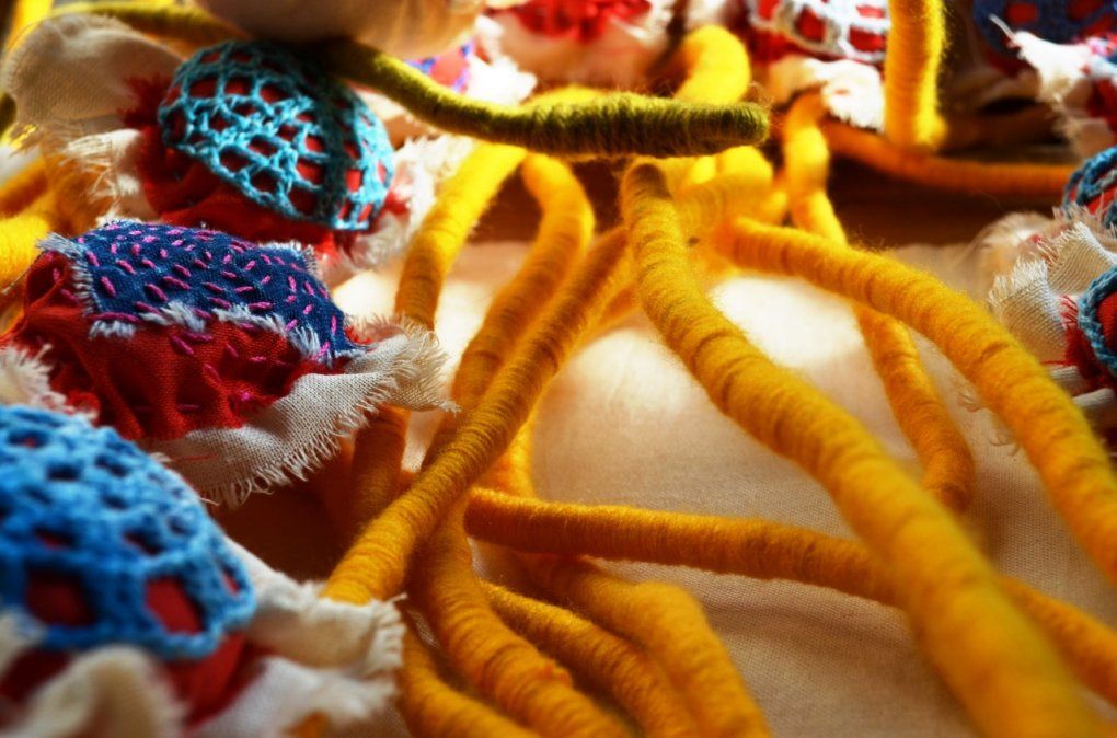 Dice la artista: “Espejos es una producción artística que reúne variedad en su forma de hacer. Partiendo de la fotografía, pasando por los teñidos y abarcando diferentes técnicas e intervenciones textiles. Desde la pared hacia el espacio que recorremos, desde los tradicionales marcos hasta formatos y volúmenes que invitan a ser mirados de diferentes maneras y lugares. Que toman forma a través de papeles, telas, lanas, hilos y colores.