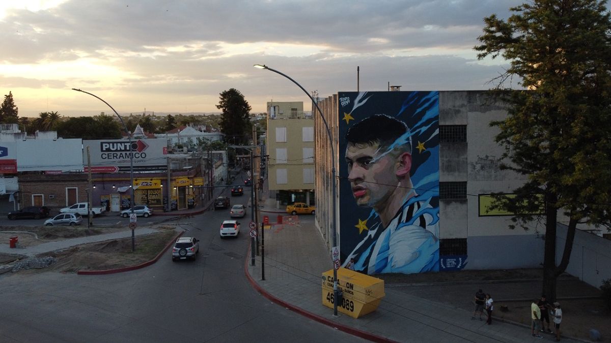 La pintura dedicada al exdefensor de Belgrano tiene 13 metros de alto, siete de ancho y es parte del conjunto artístico que en ese mismo sector ya estrenó un mural que Romero comparte con Julián Álvarez, Paulo Dybala y Nahuel Molina, los otros tres jugadores cordobeses campeones del mundo con la selección argentina.