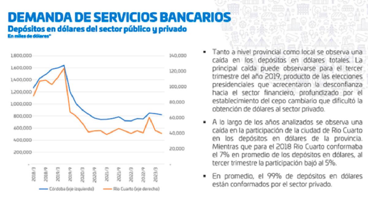 “A lo largo de los años analizados se observa una caída en la participación de la ciudad de Río Cuarto en los depósitos en dólares de la provincia. Mientras que para el 2019 Río Cuarto conformaba el 7 por ciento en promedio de los depósitos en dólares, al tercer trimestre de este año la participación bajó al 5 por ciento”, señala el informe.