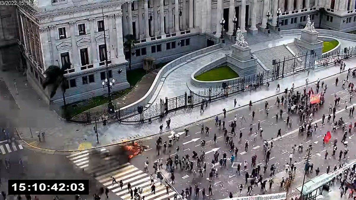 Fernández de Kirchner acompañó el mensaje con un nuevo video obtenido, según explicó, por la cámara de seguridad de la Policía Federal emplazada en la esquina de Hipólito Yrigoyen y Entre Ríos, en el que se observa cómo encapuchados arrojan bombas de pintura primero y piedras después hacia las ventanas de su oficina del lado izquierdo del Palacio Legislativo, justamente sobre la avenida Entre Ríos.