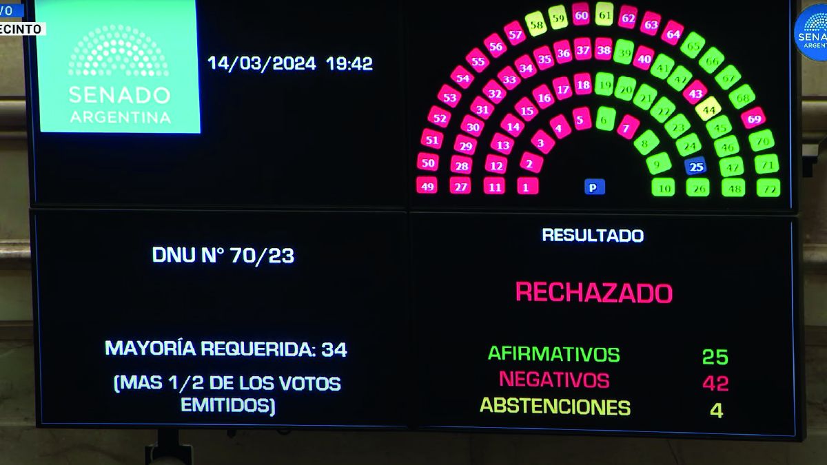 El Decreto de Necesidad y Urgencia (DNU) 70/2023 fue rechazado hoy por el Senado de la Nación por 42 votos negativos, 25 afirmativos y 4 abstenciones.