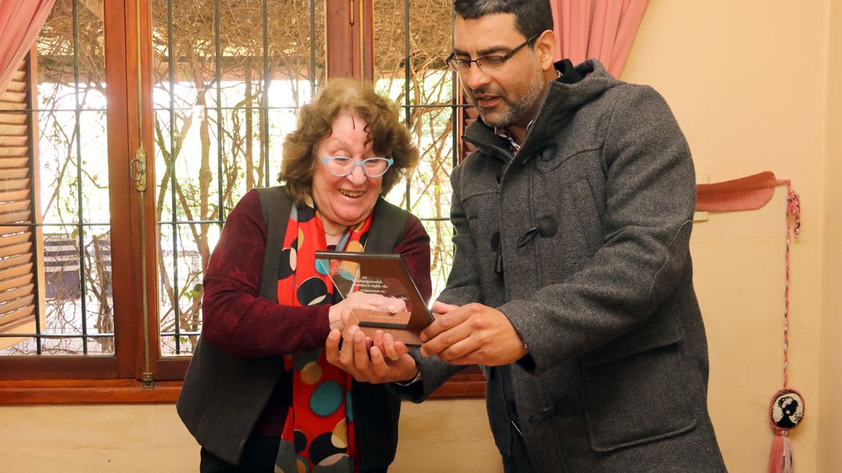 Ana María del Carmen Ceballos Houriet de Collosa es su nombre, y ayer fue sorprendida por su exalumno y actual intendente, Marcelo Agustín, quien le hizo entrega de una placa y flores.