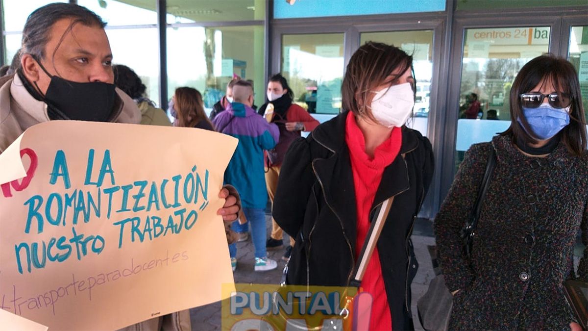 Docentes autoconvocados protestaron este lunes frente al Centro Cívico por la falta de colectivos a la región. Presentaron un petitorio con firmas en el que solicitaron regularidad de horarios que les permitan asistir a trabajar a las diversas localidades de la zona.