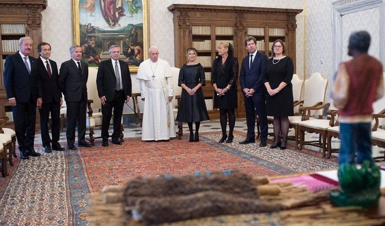 Aunque se trató de una reunión privada, luego se produjo el clásico intercambio de regalos, del que participaron los miembros de la comitiva oficial, la primera dama, Fabiola Yáñez; el canciller, Felipe Solá; la ministra de Justicia, Marcela Losardo; los secretarios de Asuntos Estratégicos, Gustavo Béliz; y de Culto, Guillermo Olivieri; el jefe de Gabinete del Ministerio de Relaciones Exteriores, Guillermo Justo Chaves, y el vocero presidencial, Juan Pablo Biondi.