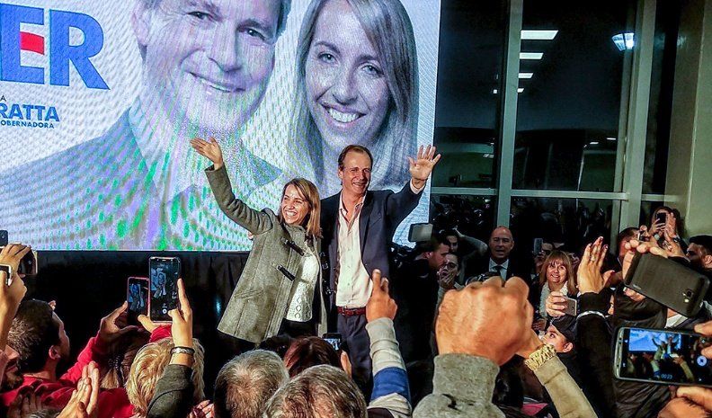 Minutos antes de las 21:30, Bordet salió a celebrar el triunfo con sus militantes en el búnker, junto a su compañera de fórmula y vicegobernadora electa, Laura Stratta.