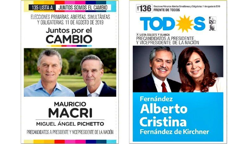 Finalmente, hay diez fórmulas presidenciales: Mauricio Macri-Miguel Pichetto (Juntos por el Cambio), Alberto Fernández-Cristina Fernández de Kirchner (Frente de Todos), Roberto Lavagna-Juan Manuel Urtubey (Consenso Federal), José Luis Espert-Luis Rosales (Frente Despertar), Juan José Gómez Centurión-Cynthia Hotton (Frente Nos), Nicolás del Caño-Romina Del Plá (Frente de Izquierda y de Trabajadores-Unidad), Manuela Castañeira-Eduardo Mulhall (Nuevo MAS), Alejandro Biondini-Enrique Venturino (Frente Patriota), José Romero Feris y Guillermo Sueldo (Partido Autonomista) y Raúl Albarracín y Sergio Pastore (Movimiento de Acción Vecinal).