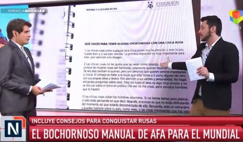 Pero entre los cuadernos que le repartieron a los asistentes se encontró un apartado de "Idioma y Cultura rusa", que en sus hojas dedica varios puntos a la categoría "Qué hacer para tener alguna oportunidad con una chica rusa". De inmediato se generó un gran revuelo al respecto. Es que allí se incluyen frases como "el consejo es tratar a la mujer que está frente a ti como alguien de valor".