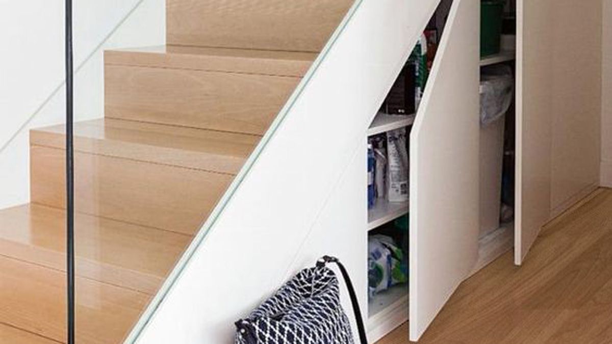 Bajo las escaleras: la escalera puede robarte muchos metros, pero con un poco de ingenio se puede rentabilizar el espacio muerto de su estructura. Este espacio es idóneo para realizar a medida un mueble de guardado, es la opción perfecta en estos casos, no suele ser barato, pero a la larga te alegrarás de haber invertido en ello.