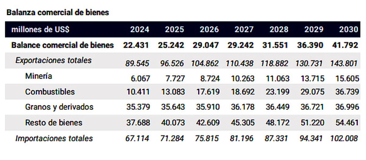 Si las proyecciones del Banco Central, que conduce Santiago Bausili, se concretan para los próximos años, habrá una mala y una buena noticia para el sector agrícola argentino. La primera es claramente que se espera casi un estancamiento en el volumen de dólares generados por la exportación de granos hasta 2030, particularmente por una leva mejora en los volúmenes, pero precios que no volverían a tener primaveras como las que mostraron años atrás. Pero por el otro lado, tal vez haya un escenario en el que el país ya no tenga una dependencia tan notoria de los dólares del agro y eso corra del foco de atención al campo argentino a la hora de requerir divisas. Es que esa misma proyección muestra un crecimiento muy significativo de otros dos sectores que empezarán a tener mayor relevancia en el comercio internacional. Hoy ya la empiezan a reflejar, pero sin dudas las líneas trazadas hacia adelante muestran que, por ejemplo, los combustibles serán grandes protagonistas al final del período proyectado e igualaría el aporte de los granos y sus derivados. Para eso recorrería un sendero que lo llevaría desde los caso 10.500 millones de dólares del año pasado a los 36.739 millones previstos para 2030; más que triplicaría su aporte. Los granos y derivados tienen, según las estimaciones del Banco Central, un camino más parejo y pasarían de los 35 mil millones a 36.996 millones en las próximas 6 campañas. La minería también triplicaría su aporte de divisas, pero parte de un piso mucho más bajo: pasaría de 6 mil millones a 15.600 millones en ese lapso.