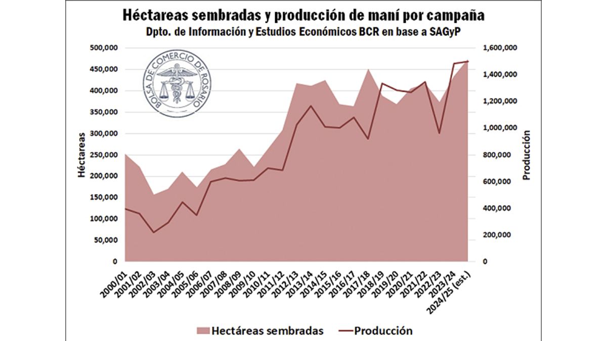Argentina no solamente registra récords por el lado de la demanda, sino que también se supera a sí misma año a año en el frente productivo. Según el informe de la Secretaría de Agricultura, Ganadería y Pesca (SAGyP), en la campaña 2024/25 se implantaron aproximadamente 473.976 hectáreas de maní en Argentina, superando en un 9% a las siembras de la campaña previa y registrando un récord absoluto de área. Al 6 de febrero, las siembras ya habían finalizado en todo el país. Con esta área sembrada, y proyectando rindes levemente inferiores a los de la campaña previa, dado el contexto inicial de escasez hídrica, puede proyectarse una producción récord de 1,5 millones de toneladas, expresado en maní caja (es decir, incluyendo la cáscara que lo contiene).