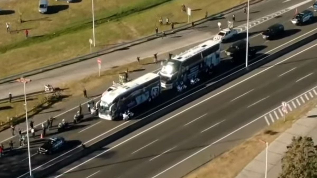 Pese al dispositivo de seguridad apostado en el lugar, los fanáticos lograron rodear a los ómnibus sobre la autovía para ver de cerca a los futbolistas, que agradecieron el cariño con gestos y retrataron el momento con sus celulares.