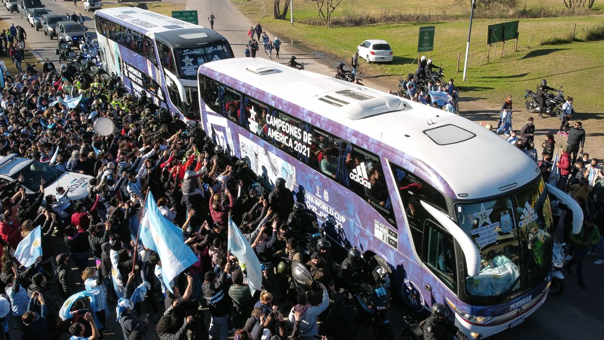 Los dos micros, ploteados con la leyenda "Campeones de América 2021", avanzaron a paso de hombre en algunos tramos del recorrido hacia el predio de la AFA, donde los futbolistas se separarán por primera vez en 50 días tras realizar una estricta burbuja sanitaria para la competencia de selecciones nacionales.