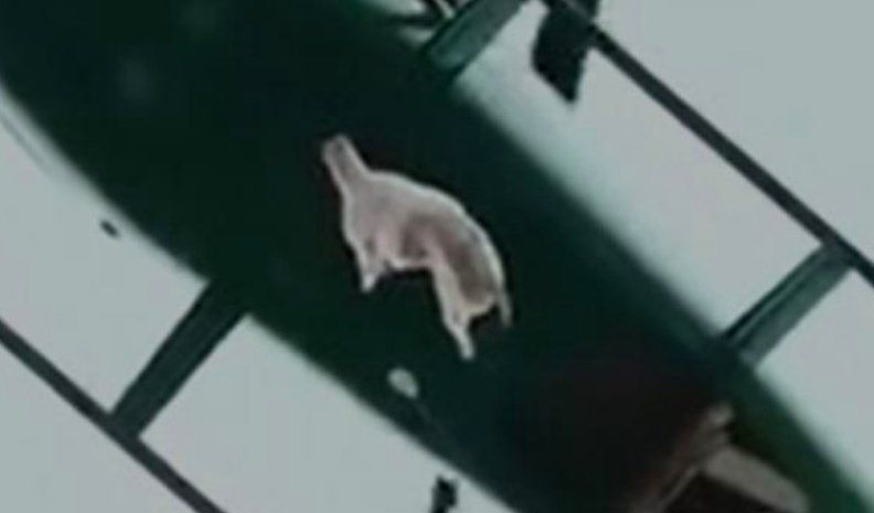 Este nuevo video muestra que en realidad el animal lanzado desde el helicóptero era un cordero, y que al momento de arrojarlo de la nave no solo está muerto sino que también se lo ve eviscerado y sin cabeza, tal como se puede encontrar en una carnicería, listo para su consumo.