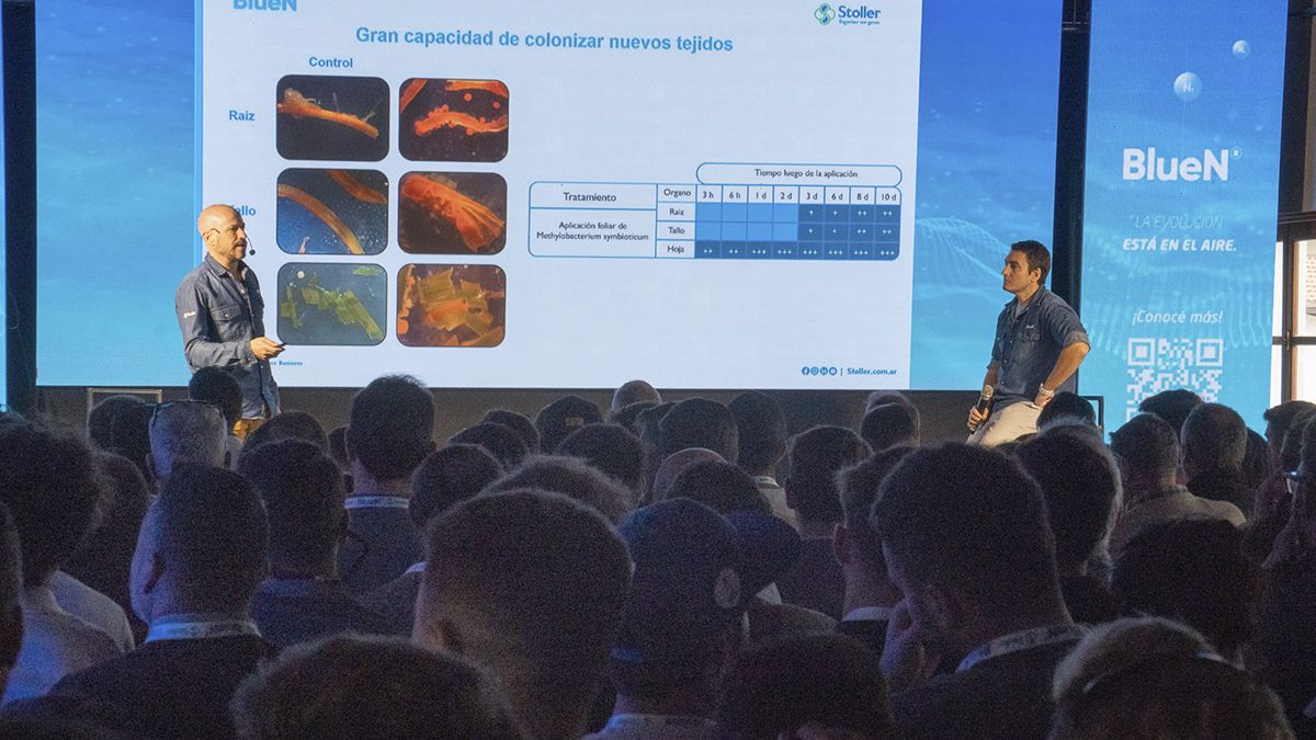Luego de la jornada, en diálogo con Tranquera Abierta, Santiago Casas, coordinador de Desarrollo de Mercado de Centro y NEA Stoller, dio detalles del nuevo producto y remarcó que “BlueN es algo novedoso porque se trata de una bacteria que fija nitrógeno. Y las que habitualmente conocemos y usamos son tratamiento de semillas, todas van al suelo y son rizosféricas. En este caso es de aplicación foliar. La bacteria entra en la planta y eso tiene una serie de ventajas. Pensemos que cuando es rizosférica, compite con muchísimos organismos en el suelo por la misma comida. En cambio, dentro de la planta la bacteria está sola, se alimenta del crecimiento de esa planta, y el ambiente es mucho más estable que alrededor de la raíz porque el suelo se seca, se inunda. Por eso la bacteria se siente mucho más cómoda cuando es endófita que cuando es rizosférica”.