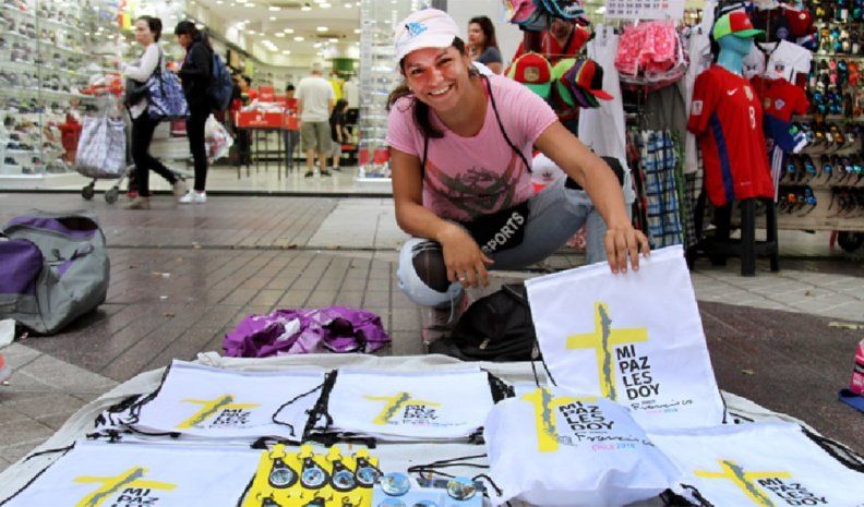 Ailé trazó ese viaje desde hace unas pocas semanas y aprovechó la visita del Papa para tener una oportunidad laboral y ganar algunos pesos chilenos. Por eso se instaló en el piso en una de las peatonales, a pocas cuadras de la Casa de la Moneda. Allí ofrece bolsitos, prendedores y remeras de Francisco.