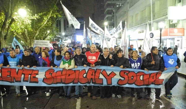 Bajo la llovizna, distintas agrupaciones que conforman el Frente Sindical y Social de Río Cuarto se movilizaron por el centro de la ciudad con consignas en contra del Gobierno.