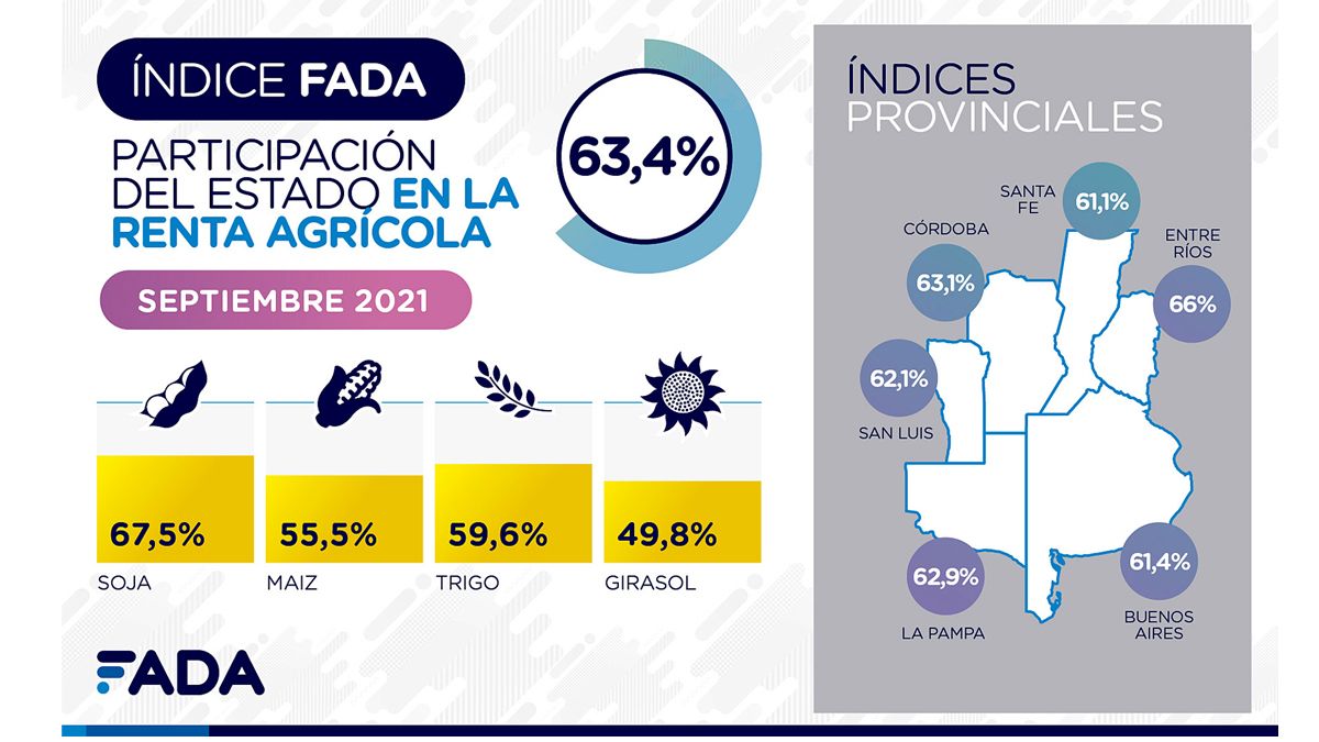 El Índice Fada ofrece distintas mediciones: el promedio de cultivos ponderado a nivel nacional marcó 63,4%, pero también muestra cómo se da en distintos granos. En el caso de la soja es del 67,5%, maíz 55,5%, trigo 59,6% y girasol 49,8%. En cuanto a los índices provinciales, Córdoba registra un 63,1%, Buenos Aires 61,4%, Santa Fe 61,1%, La Pampa 62,9%, Entre Ríos 66,0% y San Luis 62,1%.