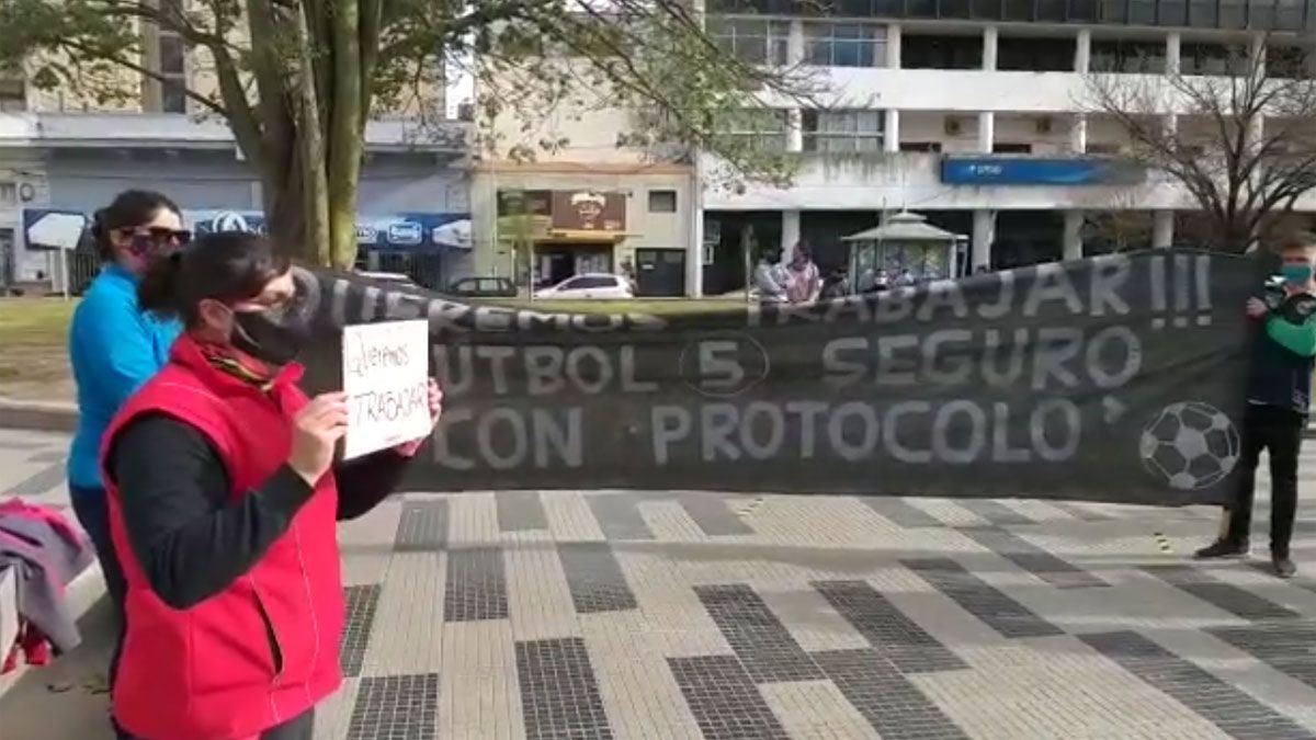 Representantes de los complejos de fútbol de la ciudad se concentraron en la mañana de este jueves frente al Palacio Municipal para reclamar por el retorno a la actividad. Unas 30 personas estuvieron encabezando la protesta bajo el lema "Queremos trabajar!!! Fútbol 5 seguro con protocolo".