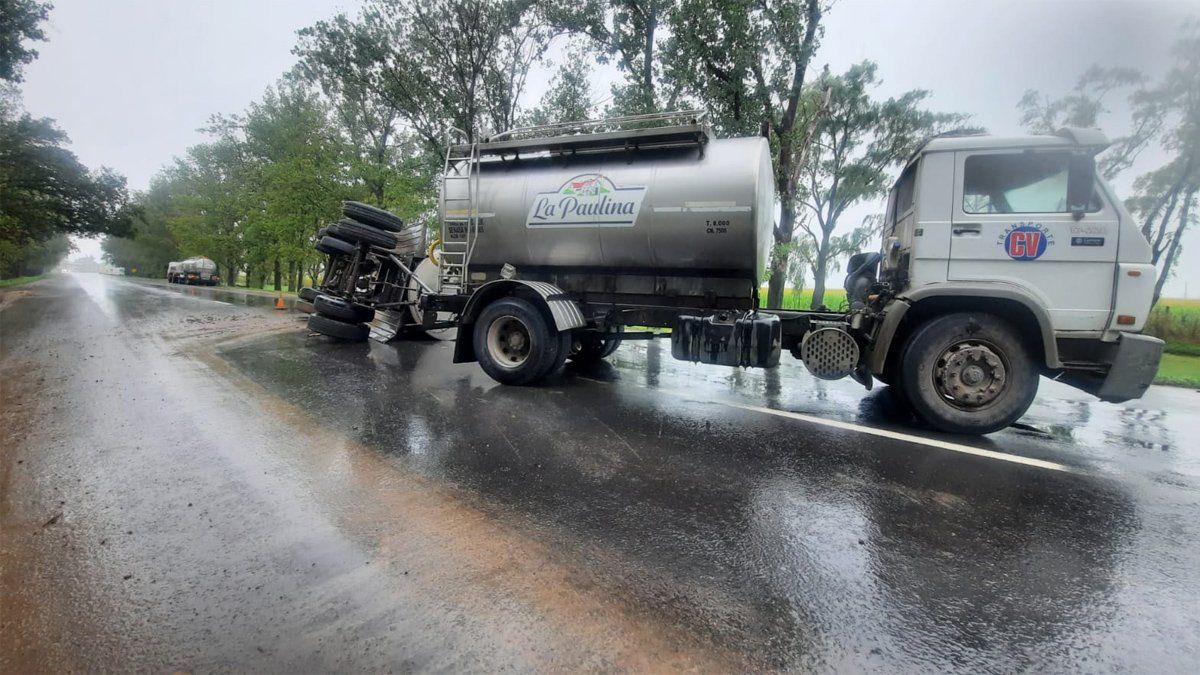 El acoplado de un camión cisterna, destinado al transporte de leche, volcó esta tarde en el acceso sur a General Cabrera. El accidente no dejó heridos, destacaron fuentes policiales.