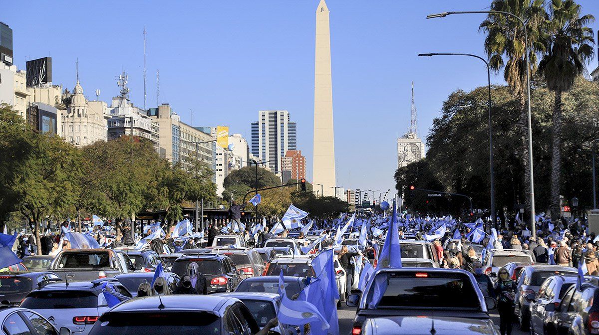 Alrededor del Obelisco, cientos de personas con banderas argentinas se concentraban, en su gran mayoría con barbijo y respetando el distanciamiento social, mientras que también se sumaban largas colas de vehículos.