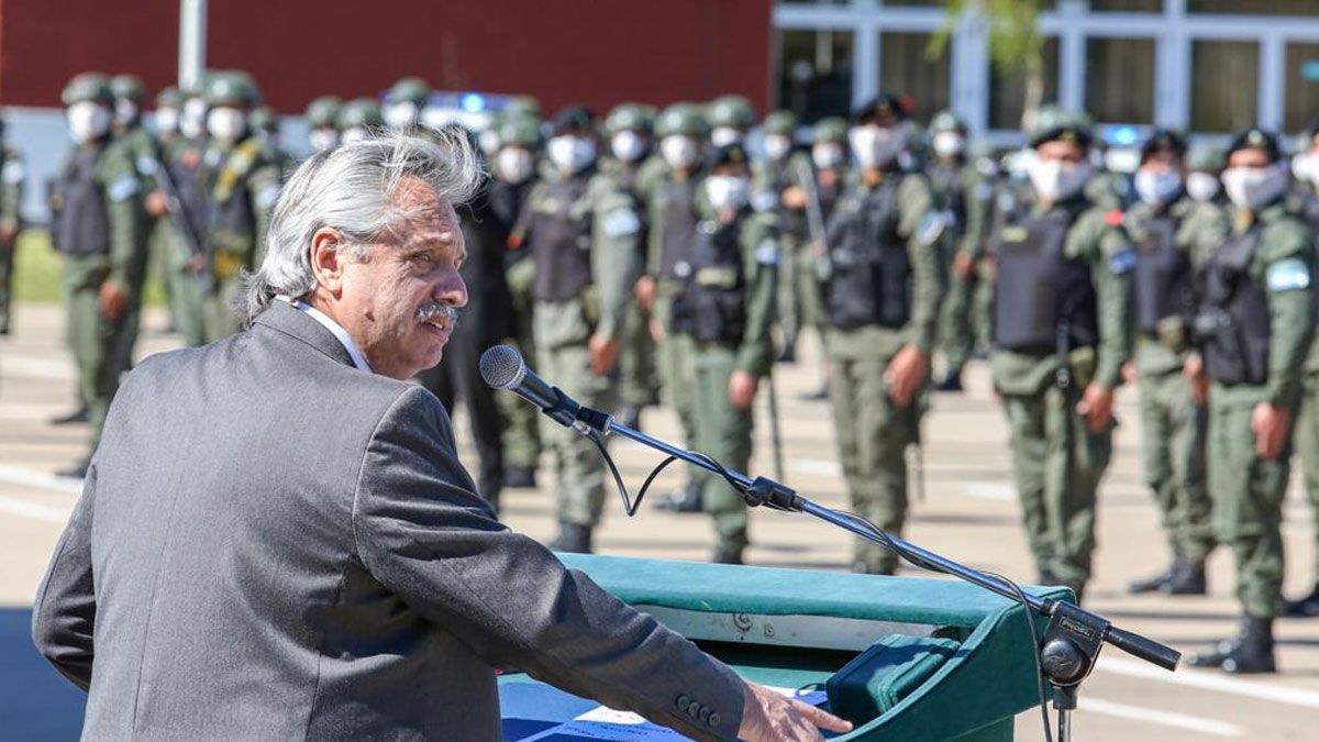 "Quiero darle las gracias a todos los gendarmes y al hacerlo, les doy las gracias a todos los miembros de las fuerzas de seguridad que todos los días salen a la calle y se arriesgan al contagio", porque "están trabajando para preservar a los argentinos de este hecho maldito que es el coronavirus", remarcó el jefe de Estado en su intervención.