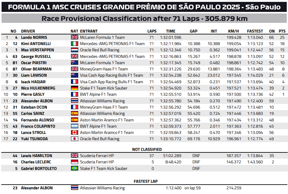 Andra Kimi Antonelli (Mercedes), también de un fin de semana notable, subió al segundo escalón del podio y Max Verstappen (Red Bull) marcó el interés de toda la afición al llegar al tercer escalón del podio luego de largar desde la calle de boxes, al cambiar motor y puesta a punto de su auto.Franco Colapinto 15º sin encontrar el ritmo necesario en su Alpine
