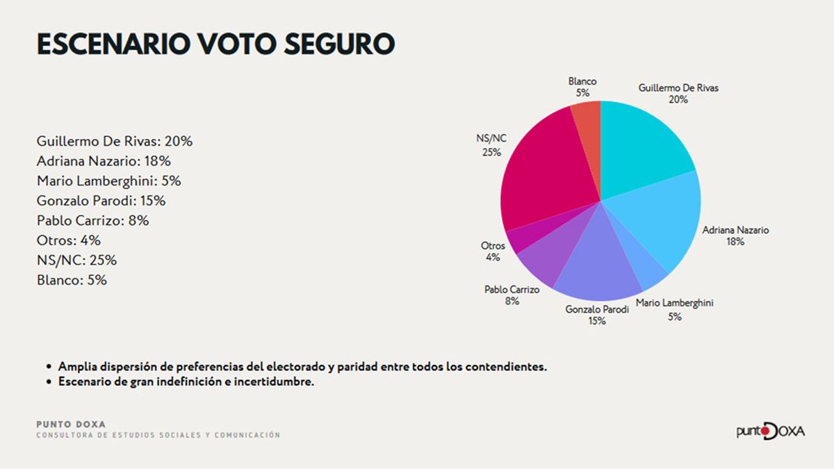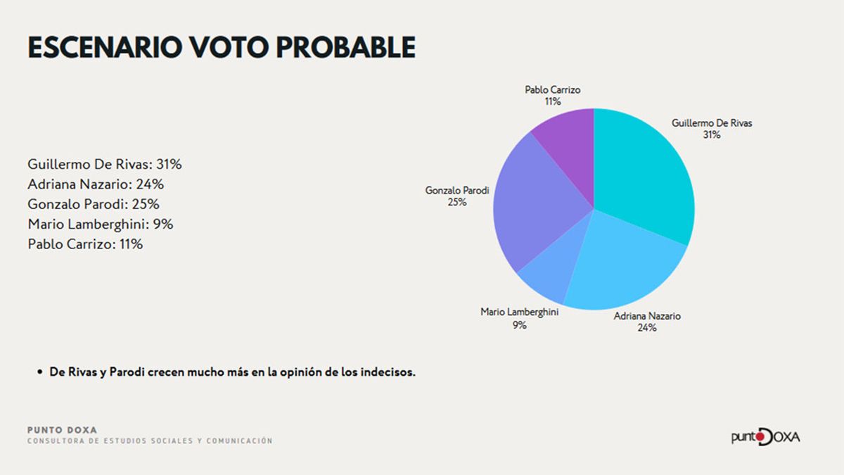 La encuesta marca que, actualmente, el voto seguro para De Rivas alcanza el 20 por ciento, mientras que Adriana Nazario, que podría ir por fuera del peronismo, llega a los 18 puntos. En tercer lugar queda Gonzalo Parodi, candidato de la UCR, con 15 puntos, cuarto Pablo Carrizo, con 8, y quinto el libertario Mario Lamberghini, con 5 puntos.
