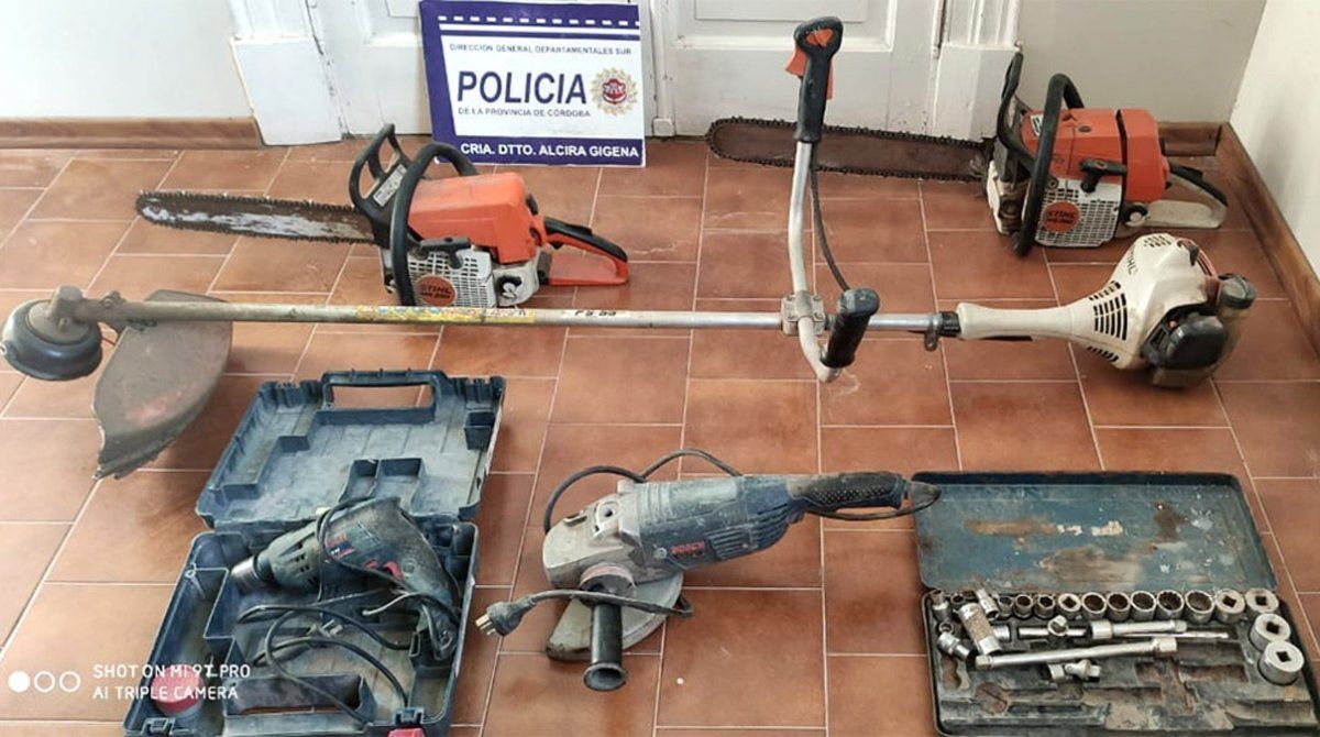 Dos motosierras, una motoguadaña, una amoladora, un taladro y herramientas varias fueron secuestrados durante un allanamiento realizado por efectivos policiales de la comisaría de Alcira Gigena, en el marco de la investigación por delitos contra la propiedad. El procedimiento fue en un domicilio de calle 25 de Mayo s/n°. Por el momento no hay detenidos, aunque avanza la investigación.