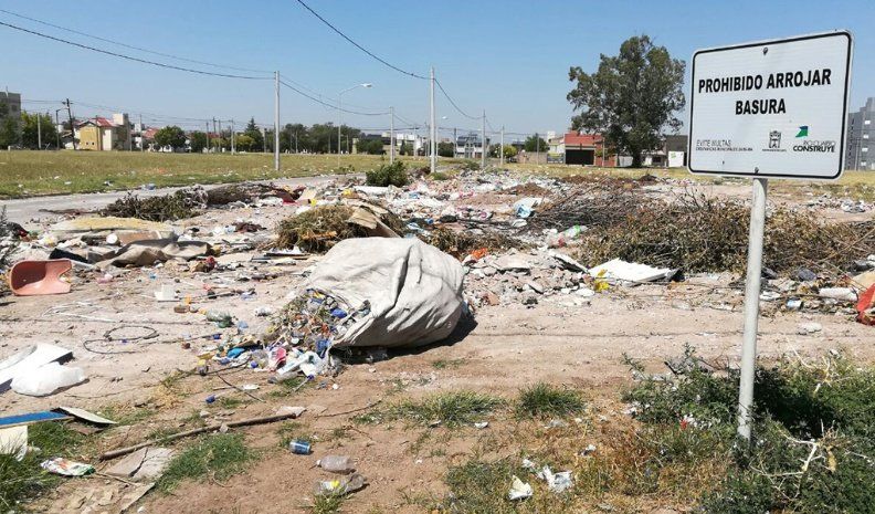 Un cartel relativamente nuevo colocado en la esquina de Sadi Carnot y Franklin, a unas 15 cuadras de la Plaza Roca, se advierte que está prohibido tirar basura y recuerda las multas vigentes. A su alrededor crece sin pausa un enorme basural. Pedazos de lavarropas, colchones, animales muertos, entre escombros y restos de podas se esparcen por el gran terreno ubicado en ese lugar.