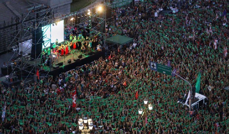 Miles de mujeres acudieron a la marcha con pañuelos verdes, símbolo del reclamo a favor de la interrupción voluntaria del embarazo, y hubo discursos breves a favor de la iniciativa sobre un escenario montado en las puertas del Congreso.