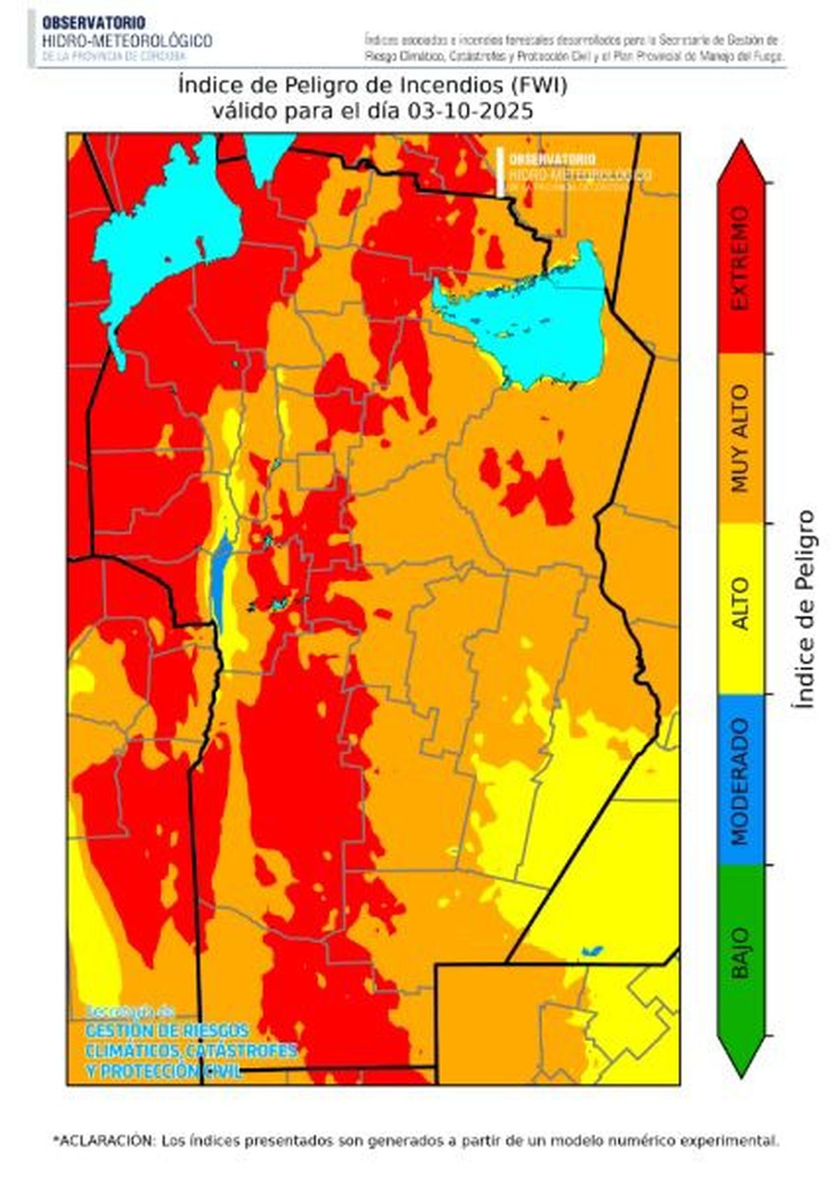 La Secretaría de Gestión de Riesgo Climático, Catástrofes y Protección Civil, dependiente del Ministerio de Seguridad de la Provincia de Córdoba, informa que hoy viernes y mañana sábado el riesgo de incendios será muy alto y extremo, según la región, debido a las condiciones climáticas con altas temperaturas y bajos niveles de humedad.