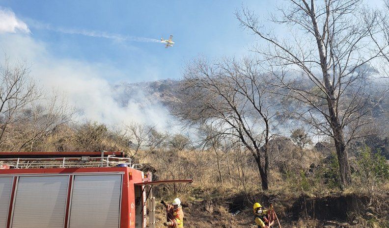 Bomberos con la intervención de aviones hidrantes trabajan en los focos producidos en La Calera y La Granja. En ésta última localidad tuvieron que suspender las clases en la escuela Ingeniero Alberto Mascías que era utilizada como base operativa.