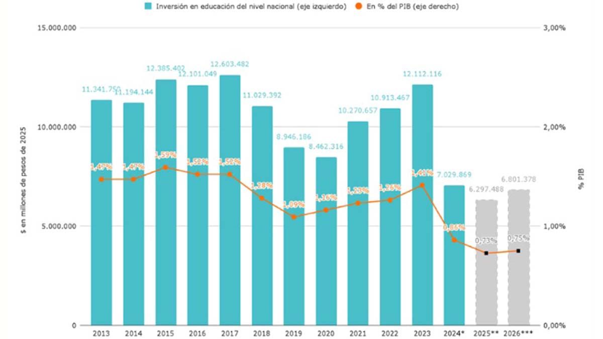 La inversión nacional en educación pasó de un máximo de 1,59% del PBI en 2015 a una reducción sostenida en los años siguientes: fue de 0,86 por ciento en 2024, y las estimaciones para 2025 (0,73 por ciento) y 2026 (0,75 por ciento) confirman la tendencia descendente. El proyecto oficial prevé derogar el artículo 9 de la Ley de Educación Nacional, que desde 2006 exige destinar al menos el 6% del PIB a educación (sumando los aportes de Nación y provincias). Esa meta se cumplió sólo en el año 2015.