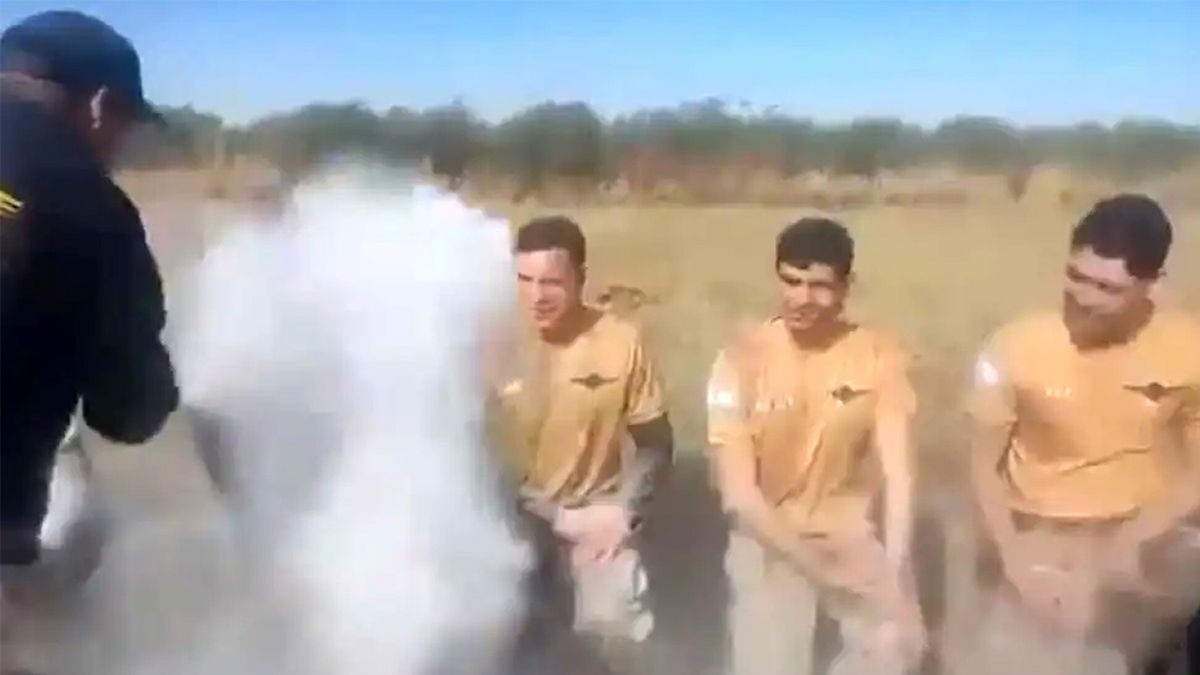 En el video que se viralizó se puede ver que, en el establecimiento militar, un superior les gritaba a jóvenes de 20 a 25 años que tenían rodilla en tierra "¡Paracaidista!" y a la respuesta "¡Siempre!", les arrojaba cal viva en las caras, que quedaban completamente blancas.