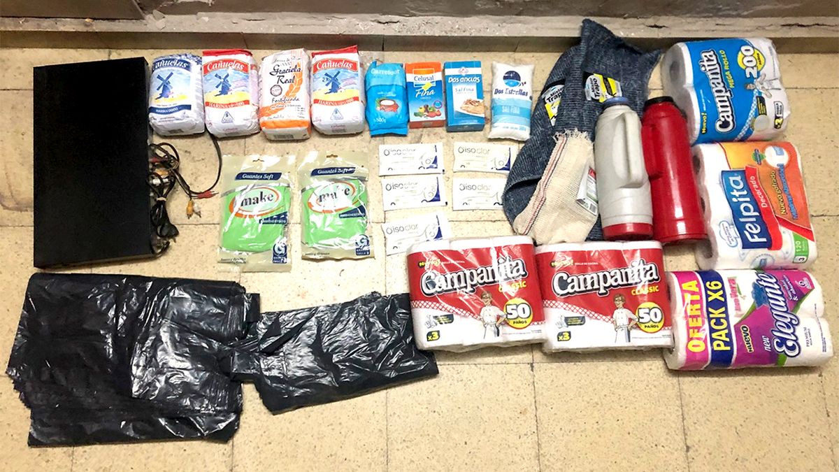 En el interior de la bolsa había varios rollos de papel higiénico, servilleta de papel, dos termos, harina, sal, trapo de piso, rejillas y un reproductor de DVD. Estos elementos correspondían a los denunciados como robados en el jardín de infantes.