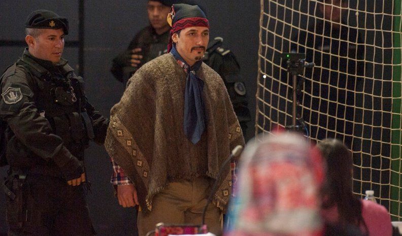 Esposado, vistiendo ropas típicas mapuches y cubriendo su rostro con un casco, Jones Huala ingresó al recinto y solicitó mantener una audiencia a solas con su defensora, lo que demoró el inicio.