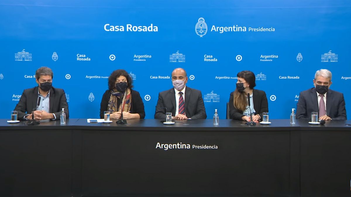 Manzur estuvo acompañado por el ministro de Seguridad, Aníbal Fernández; la titular de la cartera de Salud, Carla Vizzotti; y el ministro de Turismo y Deportes, Matías Lammens.
