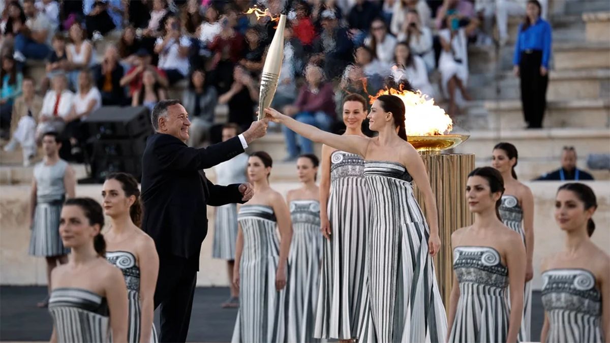 Varios miles de aficionados y turistas se sentaron en las gradas del estadio de mármol con forma de caballo en una tarde soleada en la que el director de los Juegos de París, Tony Estanguet, recibió la antorcha de manos del Presidente del Comité Olímpico Griego, Spyros Capralos.