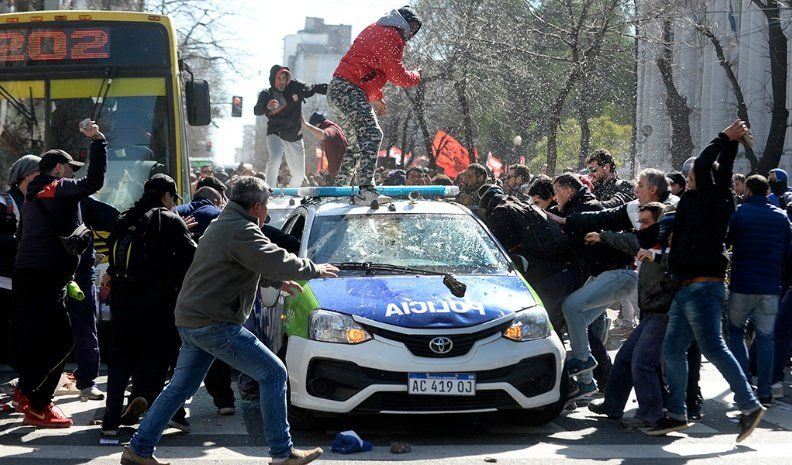 Los hechos de violencia se desencadenaron alrededor de las 13.45 cuando, según indicaron la Policía y la Fiscalía interviniente, los manifestantes intentaron derribar la reja que rodea la Casa de Gobierno e ingresar al edificio.