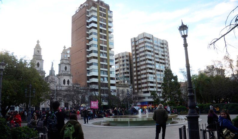 La Plaza Roca, el lugar más emblemático; detrás, el Parque Sarmiento y la iglesia Catedral