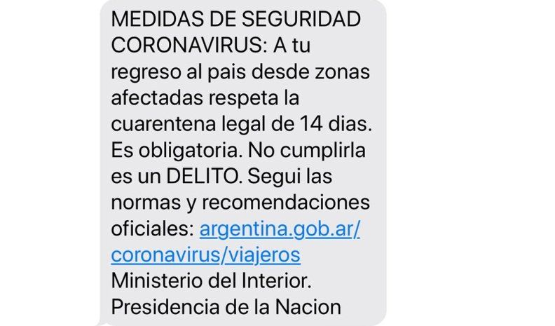 El SMS enviado de manera personalizada a las personas que viajaron al exterior, señala: "A tu regreso al país desde zonas afectadas respetá la cuarentena legal de 14 días. Es obligatoria”, decía el mensaje, que además advertía en mayúsculas: “No cumplirla es un DELITO”.