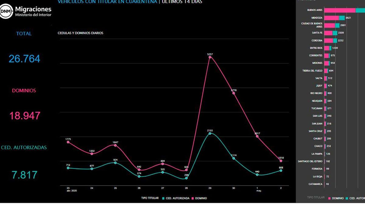 El Ministerio del Interior, a través de la Dirección Nacional de Migraciones (DNM), lanzó un nuevo portal destinado a las autoridades provinciales para controlar y contener la expansión del Covid-19. Desde la plataforma se puede acceder a información actualizada a cada hora sobre ingresos al territorio nacional por pasos migratorios habilitados, al cruzamiento de datos asociados a la titularidad de los vehículos de los ingresantes y a controles de permanencia de extranjeros.