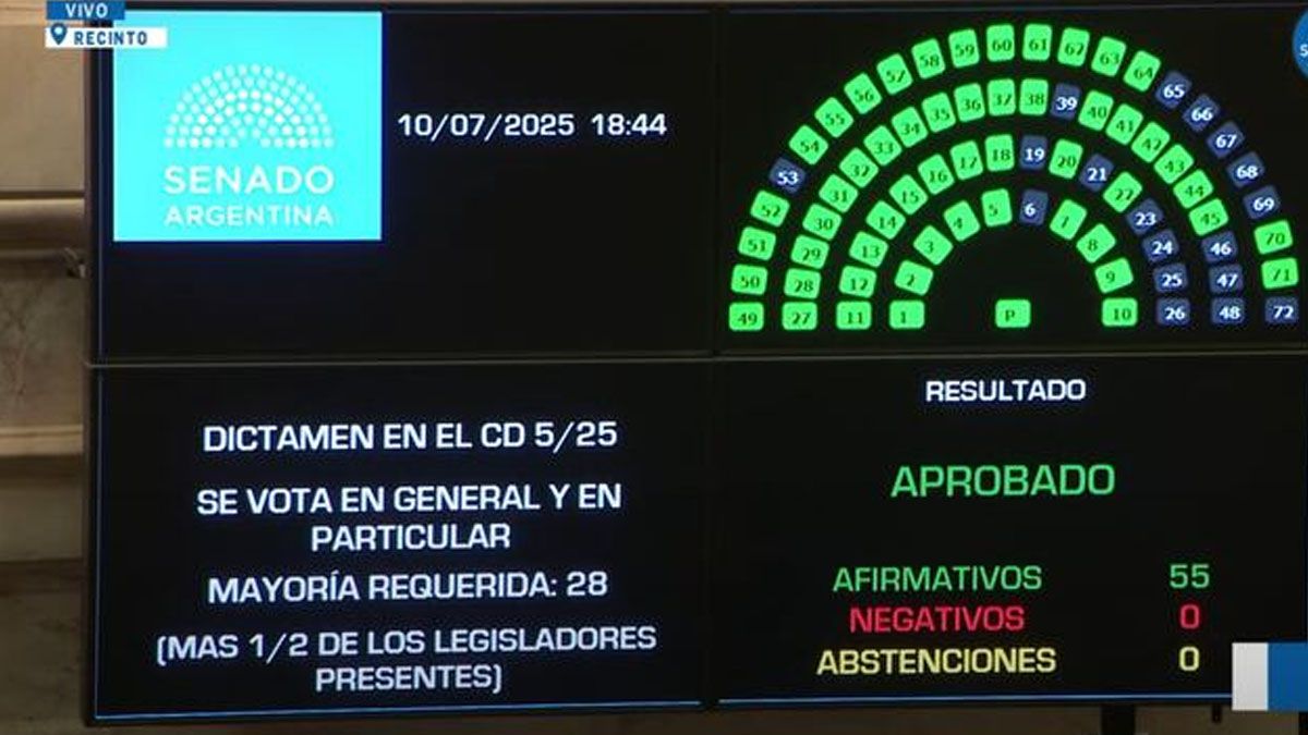 La iniciativa fue aprobado por 56 votos que fueron aportados por los senadores peronistas, radicales, provinciales, y los legisladores del PRO Guadalupe Tagliaferri y Luis Juez.