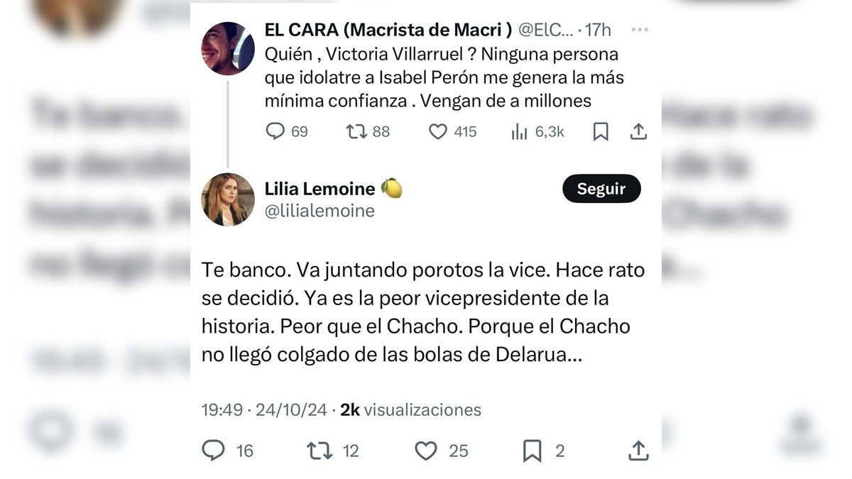 Luego de que un usuario criticara a Villarruel por su reivindicación a Isabel, Lemoine planteó: “Te banco. Va juntando porotos la vice”.