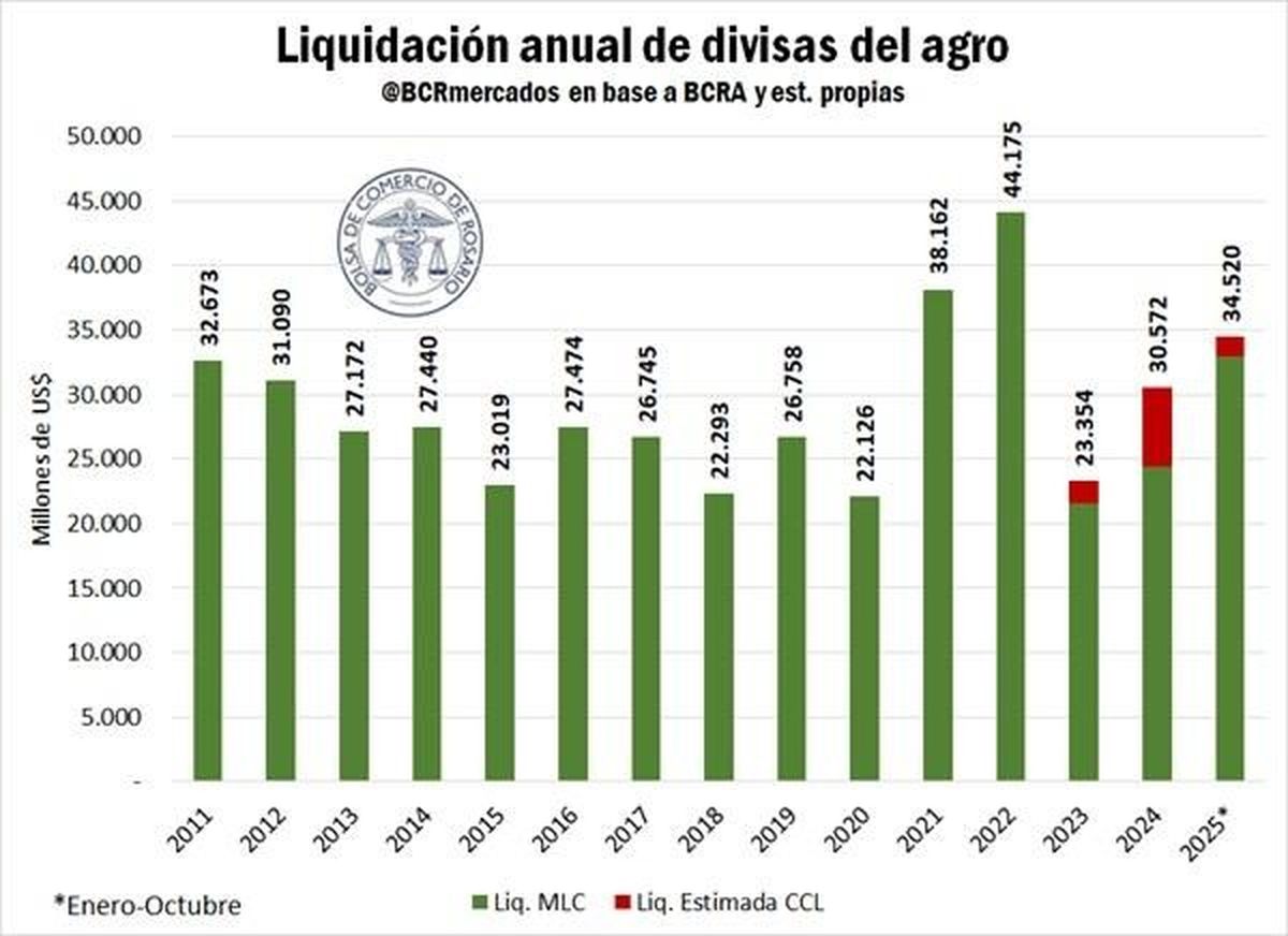 Los diversos incentivos que estuvieron vigentes durante el año (“dólar blend”, rebaja y eliminación temporaria de retenciones) dejaron el volumen liquidado de divisas del agro entre enero y octubre en US$ 34.500 millones: casi US$ 33.000 millones en el Mercado Libre de Cambios (según datos del Banco Central y de la Cámara de Industrias Aceiteras y el Centro de Exportadores de Cereales) y un estimado de US$ 1.550 millones ingresados vía el dólar CCL.