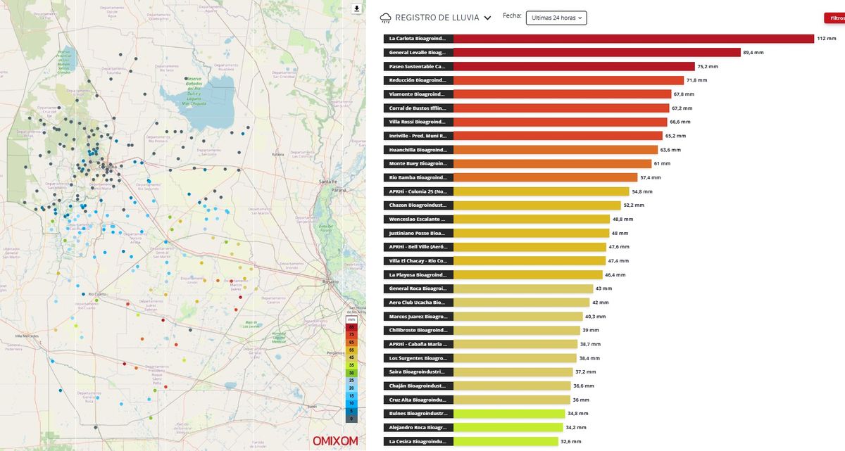 De acuerdo con los datos, la localidad donde más agua cayó fue La Carlota, con 112 milímetros en las últimas horas.