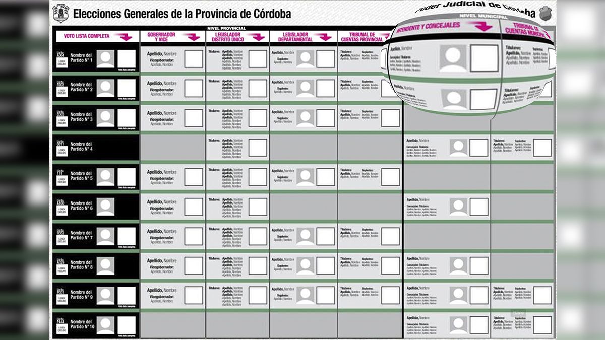 A diferencia de las elecciones municipales ya realizadas, en el cuarto oscuro no habrá una boleta por cada fuerza política, sino una única que contendrá a todos los partidos y sus candidatos, desde gobernador, legisladores departamentales, legisladores distrito único y tribunal de cuentas provincial. Sumando además dos filas al final de la boleta: una para intendente y concejales y la última para tribunos de cuentas municipales.