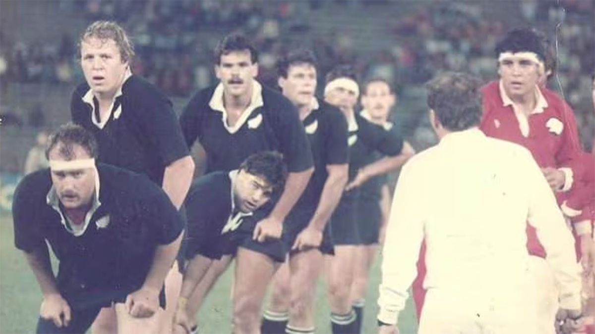 All Blacks, ante Los Dogos, en el Estadio Córdoba, en 1985. (Gentileza Dogos de los '80)