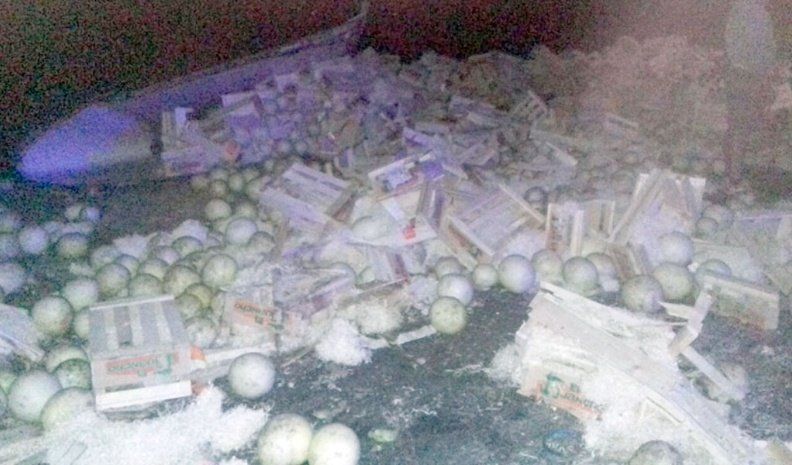 En la madrugada de este domingo, el tránsito debió ser interrumpido en ruta 7 a la altura del kilómetro 603, ya que un camión volcó su carga de sandías en el trazado luego de que se desenganchara a su acoplado semitérmico.