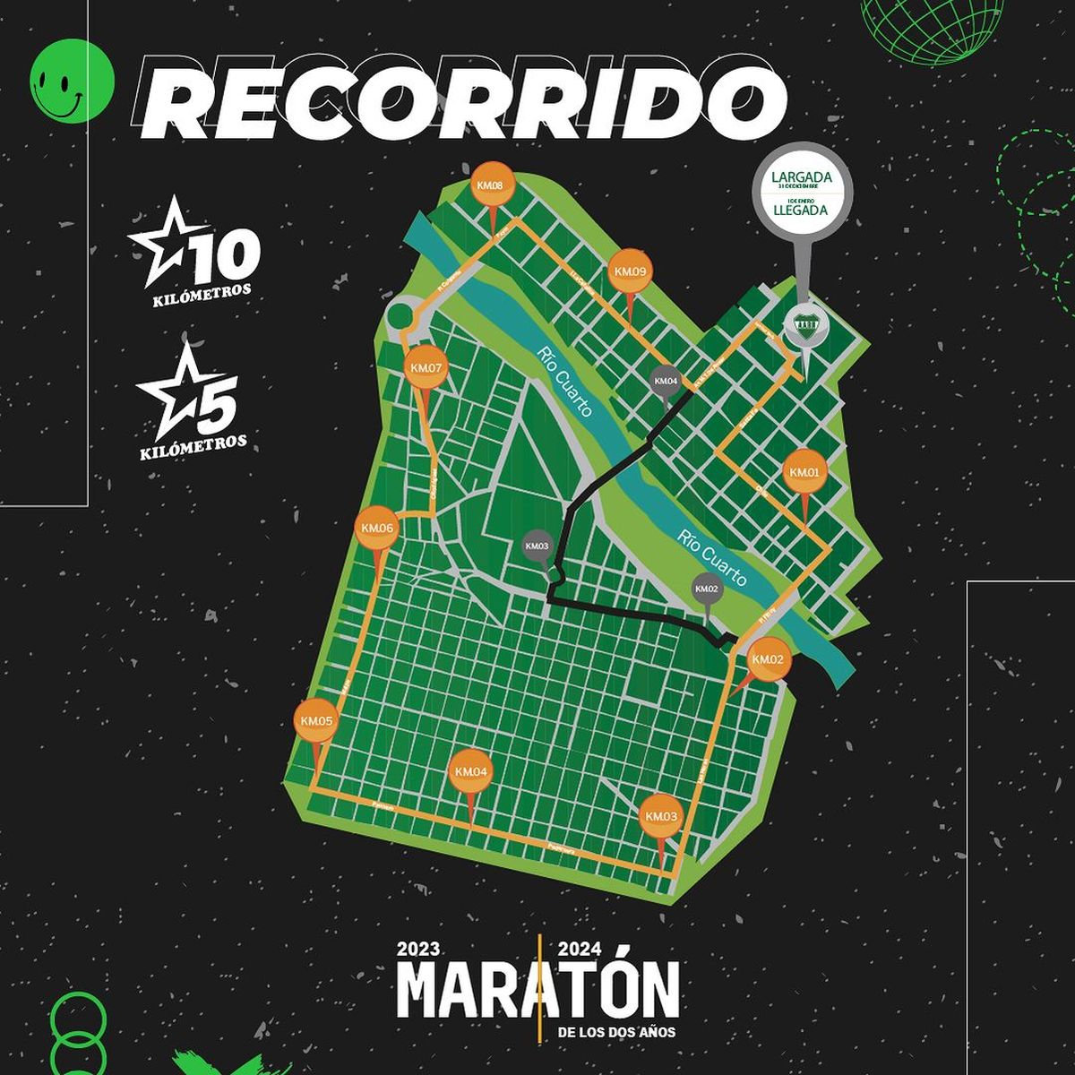 Para los participantes de los 5K: Largada: Santa Fe y Estados Unidos – Santa Fe – Chile – Dr. Francisco Muñiz – Puente Juan Filloy – Las Heras – Int. Dr. Jaime Gil – Avenida España - Marcelo T. de Alvear – Juan Cruz Varela – Santa Fe – Llegada: Estadio de A.A. Banda Norte.